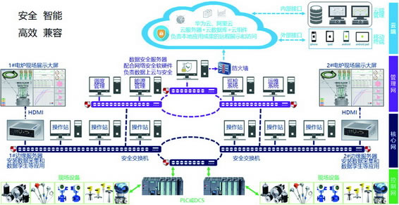 優(yōu)勢:包含控制網(wǎng)、核心網(wǎng)、管理網(wǎng)以及云端四級工廠網(wǎng)絡(luò),兼容開放性好,設(shè)置軟硬件結(jié)合的縱深防御措施,安全性好,根據(jù)實時參數(shù),按照模型進(jìn)行仿真,推薦合理的運行參數(shù),結(jié)合礦熱爐工藝參數(shù)、運行參數(shù),計算出電極工作端實際位置