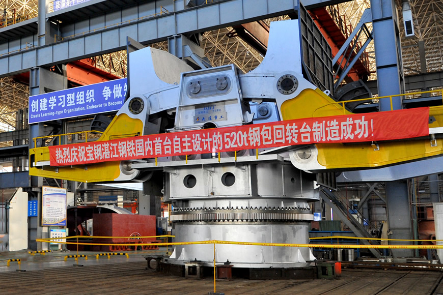 大包轉(zhuǎn)臺(tái)安裝在連鑄車間鋼水接受跨和連鑄跨之間的澆鑄平臺(tái)上,用于接受煉鋼系統(tǒng)送來的盛滿鋼水的鋼包,將鋼包轉(zhuǎn)至連鑄跨的澆注位置進(jìn)行澆注。大連重工研制的大包轉(zhuǎn)臺(tái)產(chǎn)品單臂承載能力從42噸到520噸,尤其是大噸位(大于200噸)鋼包回轉(zhuǎn)臺(tái)國(guó)內(nèi)市場(chǎng)占有率很高,產(chǎn)品功能從單一回轉(zhuǎn)型發(fā)展到多功能型。
